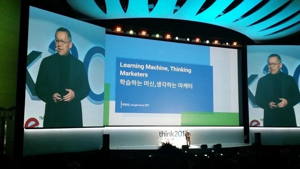 구글의 think 이벤트에서 머신러닝이 마케터에게 무엇을 제공해 줄 수 있는지에 대해 키노트 스피치 세션을 하는 장면